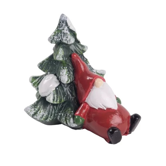 Fenyőfát támasztó piros ruhás orrmanó, poly