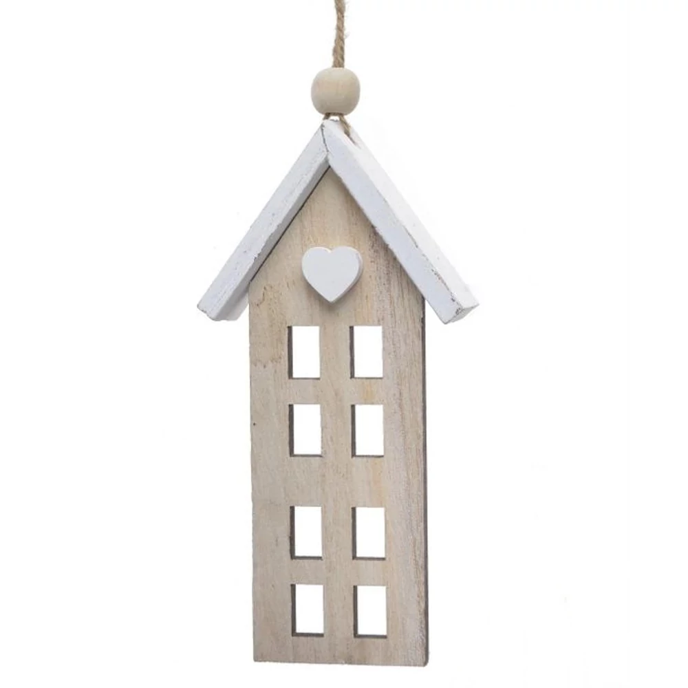 Fehér tetejű fa szivecskés házikó, hosszúkás, akasztós, 16cm