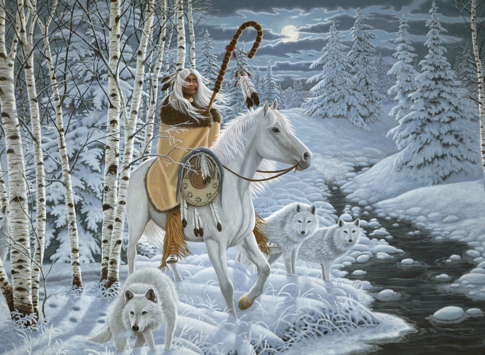 Kifestő készlet számokkal, ecsettel, felnőtteknek - 30x40 cm - Indián fehér lovon, téli táj