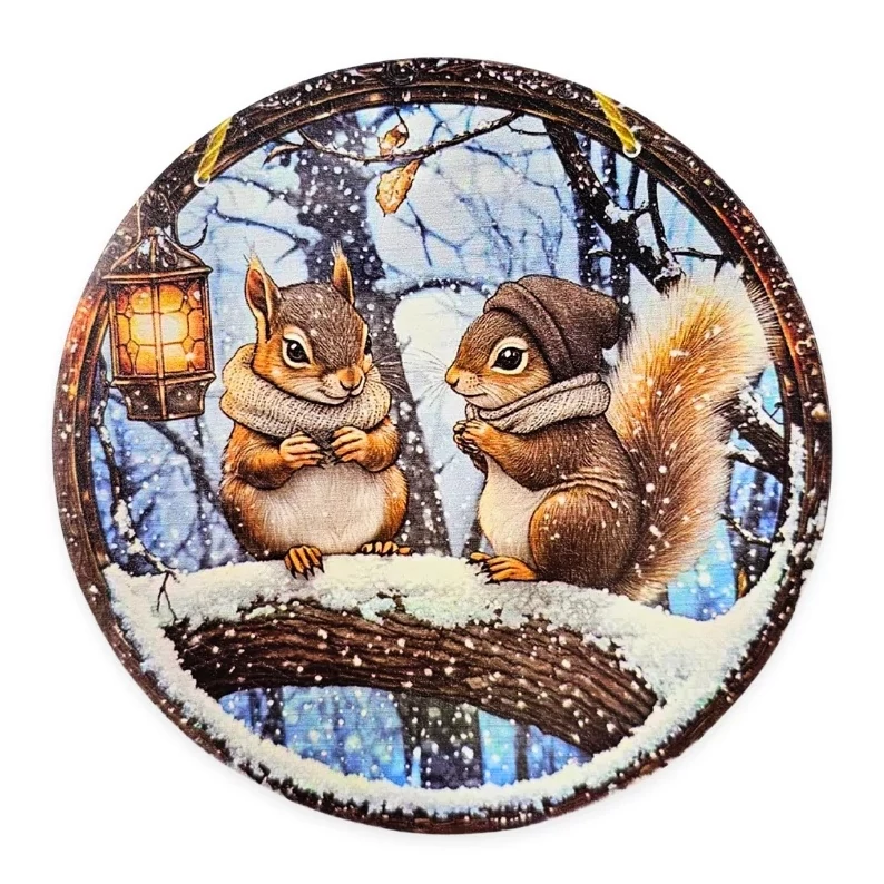 Nyomtatott fa tábla koszorú közép - Mókusok havas faágon 11,8cm