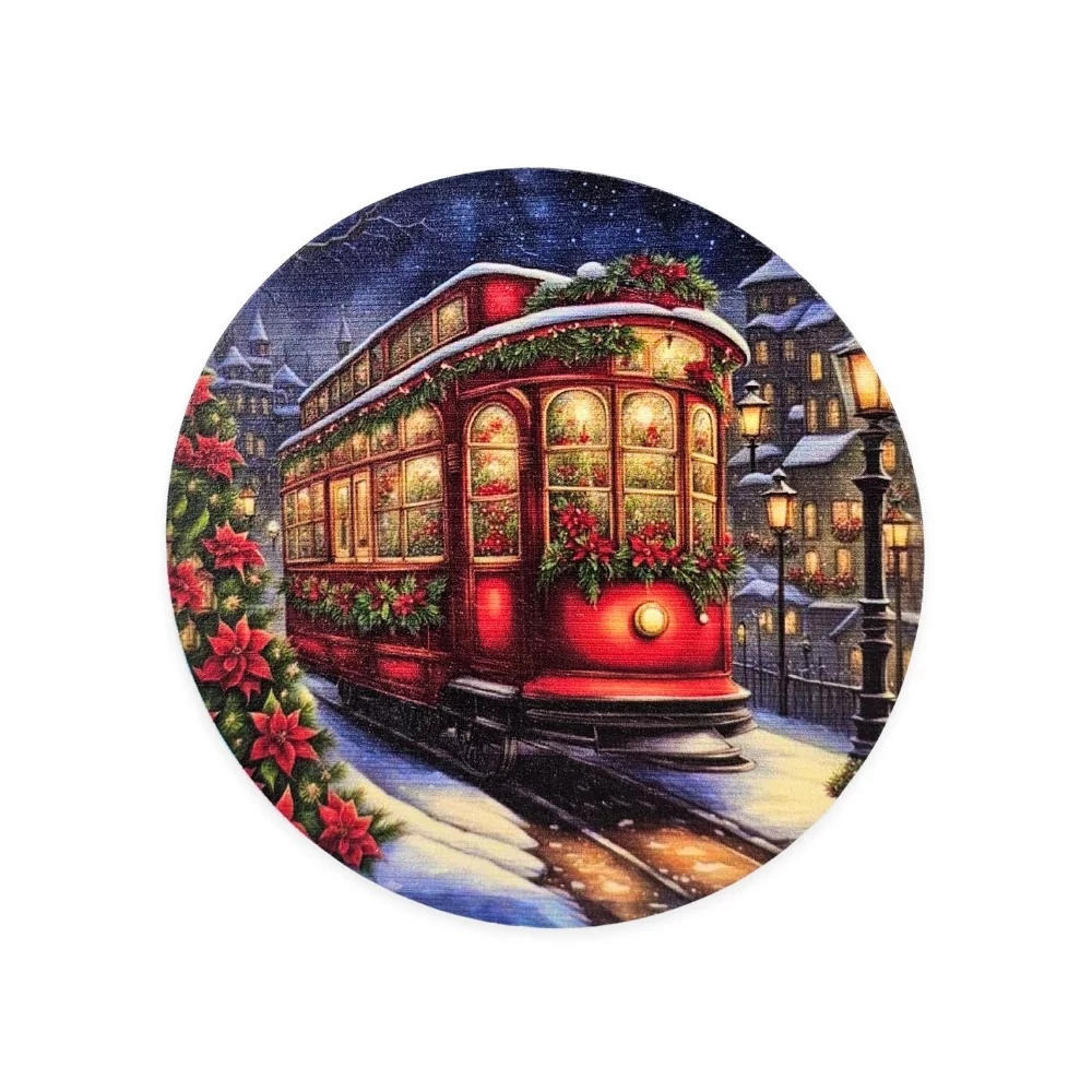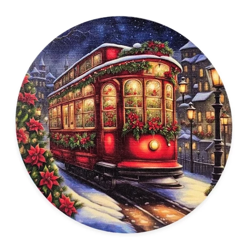 Nyomtatott fa tábla koszorú közép - Karácsonyi villamos 11,8cm